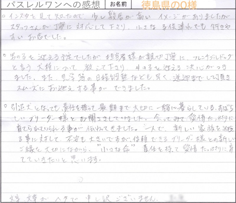 ■店長コメント 徳島県の山下様 、 お名前:ベルちゃん