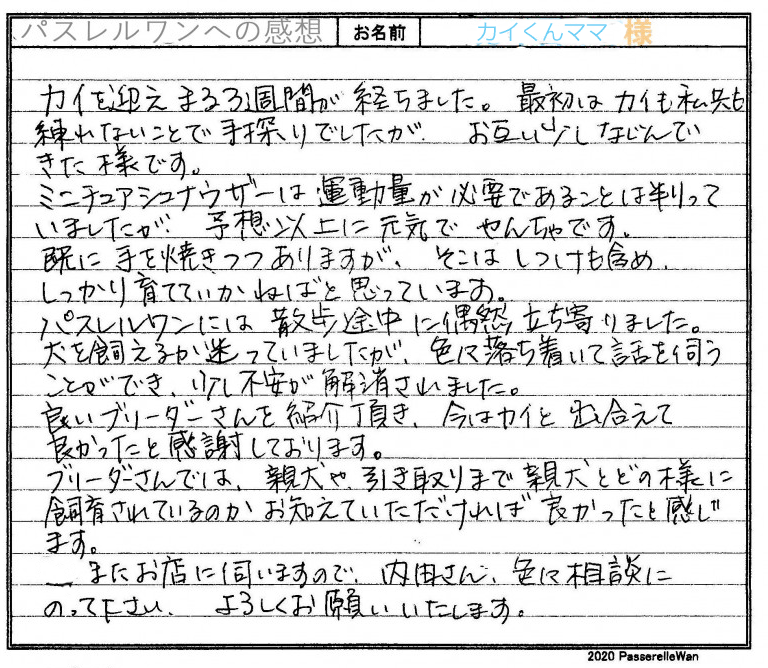子犬選びの窓口より当方へご来社の上、ご相談よりスタートいたしました。 優良なミニチュアシュナウザーとのご縁を探され、当方ご紹介の和歌山県シュナウザーブリーダーさんのもと、ご見学いただきました。 キャリアと名のある犬舎出身犬に、ご夫婦様ともに大変喜んで頂けたことを記憶しております☆その後も当店によく遊びに来てくださり、カイ君の成長を見せてくださり皆で喜んでおります^^ どうぞ素敵なミニチュアシュナウザーライフをお送りください・・・☆★☆ この度は当店をご利用いただき誠にありがとうございます。