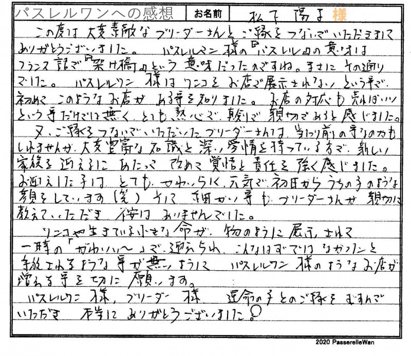 和歌山県犬舎へご見学・お迎えと二度お越しいただきました。 当店には虹の橋を渡る前に先住犬のロア君とお店によく遊びにくださり、虹の橋を渡ってしまってからも、様々な葛藤を乗り越えられ、お店にも何度も足を運んで下さり、この度、待ちに待った運命の日を迎えられましたm(__)m 目の肥えたこだわり派のご家族様へ気に入っていただき当方ブリーダーさん共に大変うれしく思います。 どうぞ素敵なフレンチブルドッグライフをお送りください・・・☆★☆ この度は当店をご利用いただき誠にありがとうございます。