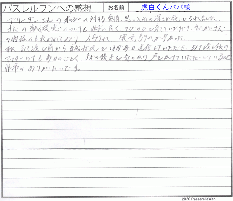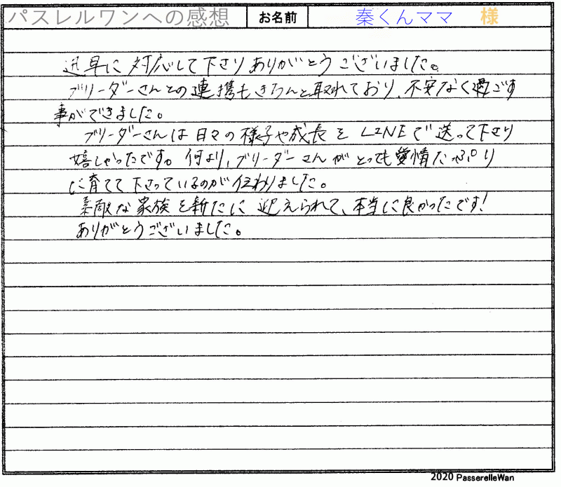 東京都より新潟県犬舎へご見学・お迎えと二度お越しくださいました。 フレンチブルドッグが大好きなご家族様で、優良な子犬との出会いを求められ、距離など関係なく、お迎えの際にはご家族様皆様でお越しくださいました^^ またご感想の中で大変貴重なご意見もお書きくださり大変うれしく思います。展示販売というのは子犬のストレスを考えなくなっていかなくてはなりません。 今後もより良いペット業界に変えていくため、微力ながら誠意一杯努めてまいります! どうぞ素敵なフレンチブルドッグライフをお送りください・・・☆★☆ この度は当店をご利用いただき誠にありがとうございます。
