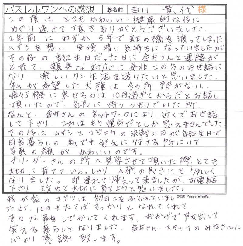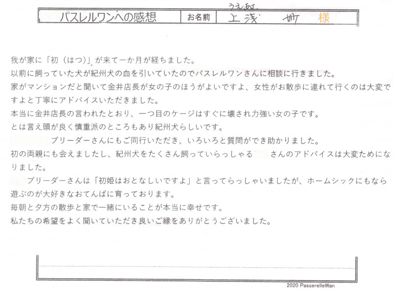子犬選びの窓口より、当方へご相談いただき三重県犬舎子犬をご紹介させて頂きました。 奇遇にもご紹介させて頂きました子犬が、奥様と同じ誕生日で、はじめから赤い糸で結ばれてたのかもしれません^^ ご見学の日は兵庫県より三重県犬舎までお越し頂き、親犬もご覧いただいた上でお迎え頂きました。 お迎え後も楽しく過ごしておられるようで安心しております。 飼育で困ったことがございましたらお気軽に当方までご相談ください。 どうぞ素敵な紀州犬ライフをお送りください・・・☆★☆ この度は当店をご利用いただき誠にありがとうございます。