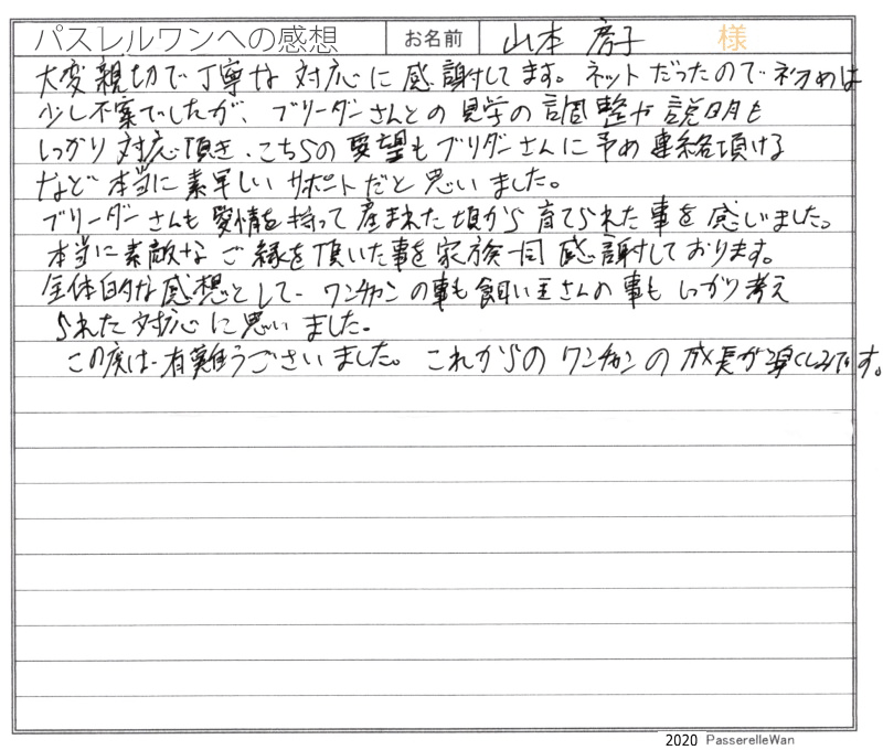 大阪府より奈良県提携犬舎子犬へご見学、お迎えと二度お越しくださいました。 アメリカンコッカースパニエルと暮らされたいとご家族様でお探しの中、ベラちゃんに運命の赤い糸を感じて頂きご見学に皆様でお越し頂きました。 ご一緒にお越し頂いたお子様達も大変喜んで頂けて、当方ブリーダーさん共に良縁に大変感謝しております^^ また落ち着かれましたら、成長のご報告など楽しみにお待ちしております♪ どうぞ、素敵なアメリカンコッカースパニエルライフをお送りください・・・☆★☆ この度は当店をご利用いただき誠にありがとうございます。