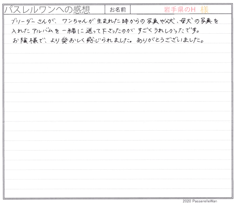 熊本県よりフェリーを乗り継ぎ、子犬のお迎えにご家族様皆様でお越しくださいました。 フレンチブルドッグと暮らされたいと、当方募集中でしたあずきちゃんが目に止まり、お問い合わせくださいました。 なかなか距離もあり、ご不安もあったかもしれませんが、お迎えの際には熊本県より皆様でお越しくださり大変お心遣いに感謝申し上げます。 お迎え後も楽しく過ごしておられるようで安心しております。兄妹で唯一の女の子、あずきちゃんの成長が楽しみです^^ 飼育で困ったことがございましたらお気軽に当方までご相談ください。 どうぞ素敵なフレンチブルドッグライフをお送りください・・・☆★☆ この度は当店をご利用いただき誠にありがとうございます。