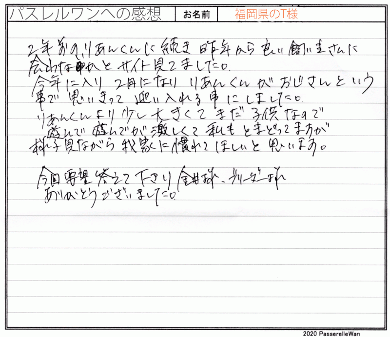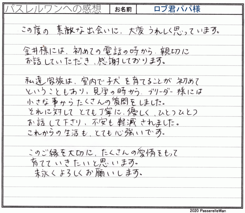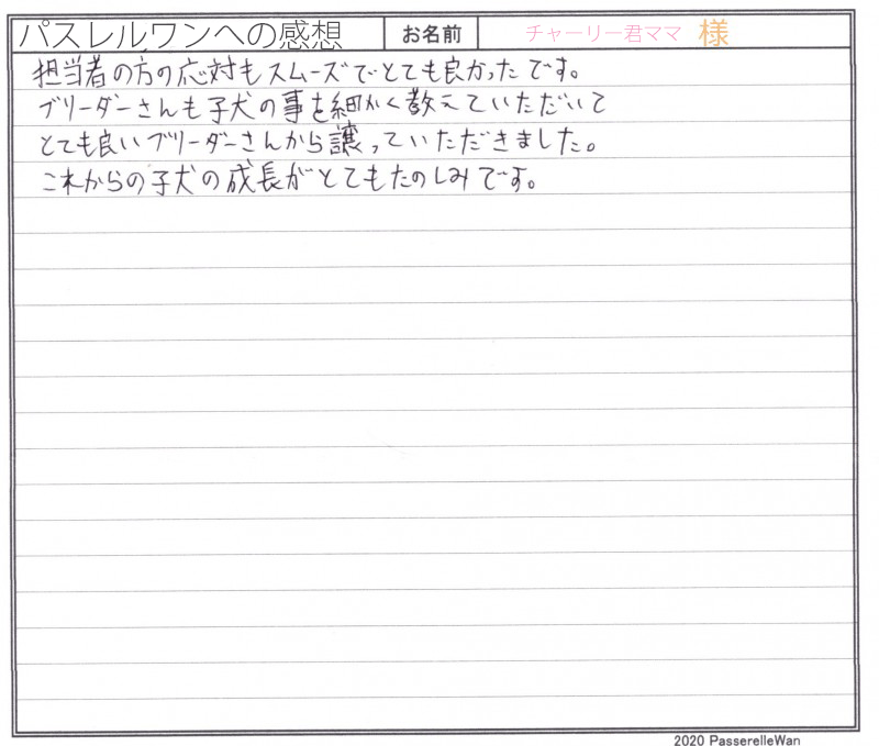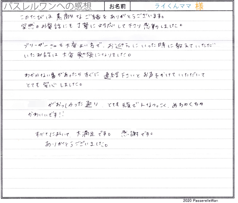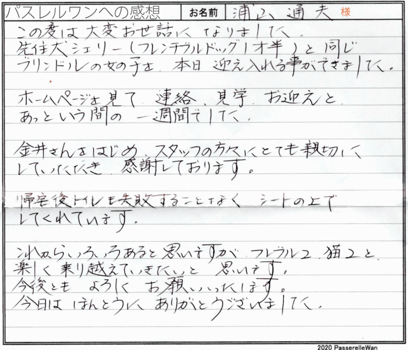 子犬選びの窓口より当方へ子犬のご相談を頂戴し、むぎちゃんとの赤い糸が結ばれました^^ ご夫婦様共にはじめてのワンコのお迎えということもあり、ご不安な点の確認から、子犬選びのポイントなど、いろいろとお話をさせて頂きました。 その様な中で、むぎちゃんと良縁が結ばれ当方ブリーダーさん共に心より嬉しく思います。 困ったときにはいつでもご相談の上、お店(兼パスレルワン事務局)にもお気軽にお立ち寄りくださいませ! どうぞ、素敵なフレンチブルドッグライフをお送りください・・・☆★☆ この度は当店をご利用いただき誠にありがとうございます。