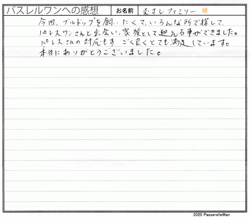 和歌山県寄より岡山県提携犬舎までご見学にお越し頂き、良縁が結ばれ当日ご一緒にお連れ帰り頂きました。 先住犬もブルドッグの飼育経験がおありのご家族様で大のブルドッグ好きのファンシャー様です♪ お迎え日より大切に育ててくださっており、今後のむさし君の成長が今から楽しみです☆何キロまで成長するでしょうw 何か困ったことがございましたら、ご遠慮なくお問い合わせ・ご相談ください! どうぞ、素敵なブルドッグライフをお送りください・・・☆★☆ この度は当店をご利用いただき誠にありがとうございます。