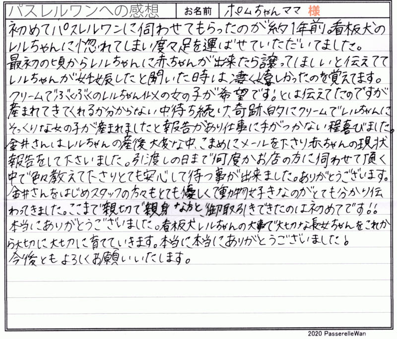 フレンチブルドッグ専門店パスレルフレンチをオープンした約一年前☆ ご来店いただきました際、看板犬レルを大変気に入ってくださりレルの子をお待ちいただく事約1年。 運命の赤い糸で結ばれていたかのように、ご希望のクリーム女の子でレルにそっくりな子が生まれました^^ いつも暖かい眼差しで、ポムちゃんを見つめるご家族様の眼差しを見て、この度の良縁に安堵と幸せを分けて頂きました。 お近くですので、いつでも母子ともに再会させてください♪ どうぞ、素敵なフレンチブルドッグライフをお送りください・・・☆★☆ この度は当店をご利用いただき誠にありがとうございます。