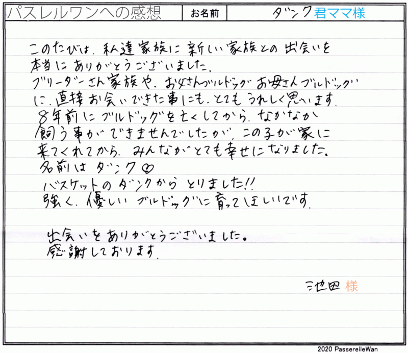愛知県寄り、岡山県提携犬舎までご見学にお越しくださり、良縁を頂戴しご一緒にお連れ帰り頂きました。 8年前に先住犬が虹の橋を渡ってからは、なかなか一歩を踏み出せずにおりましたが、この度、新たしい一歩のお手伝いが出来当方ブリーダーさん共に大変嬉しく思います。 可愛いダンクくんがこれからどれだけ大きくなるか(笑)成長を楽しみにしております^^ 飼育で困ったこと等ございました際には、ご遠慮なく当方までご相談くださいませ! どうぞ、素敵なブルドッグライフをお送りください・・・☆★☆ この度は当店をご利用いただき誠にありがとうございます。