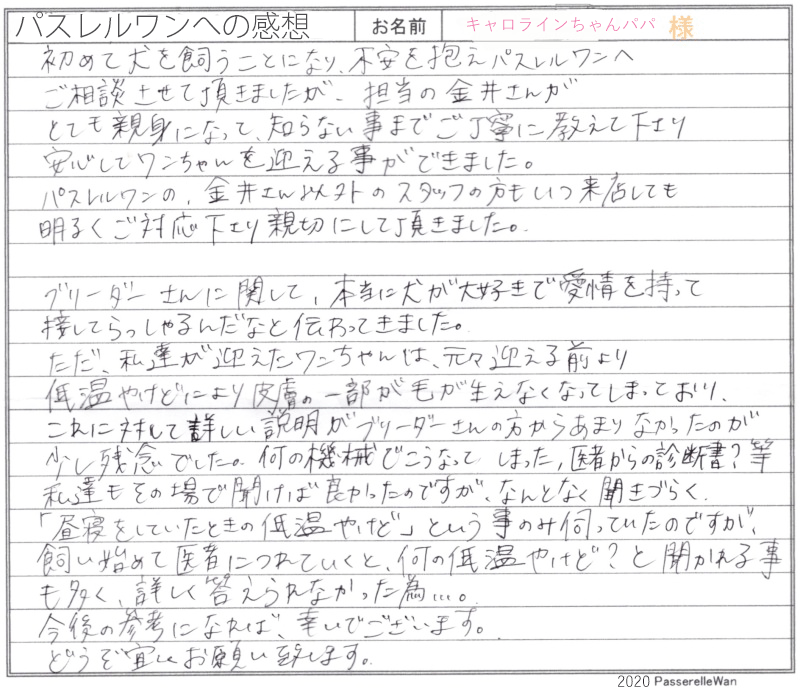 子犬選びの窓口より当方へご相談いただき、子犬情報を閲覧いただく中、キャロラインちゃんが目にとまり、東京都までご見学に行っていただきました。 ブリーダーさんの元大事に育てられたキャロラインちゃん、少しご家族様にとっては説明が足りなかった点があったようで、ブリーダーさんと共に貴重なご意見として今後に役立たせて頂きます! 明るいご夫婦様にキャロラインちゃん、とってもお似合いのご家族様です^^ 当店の方にもいつでもキャロラインちゃんを連れて遊びにお越しくださいませ! どうぞ、素敵なフレンチブルドッグライフをお送りください・・・☆★☆ この度は当店をご利用いただき誠にありがとうございます。
