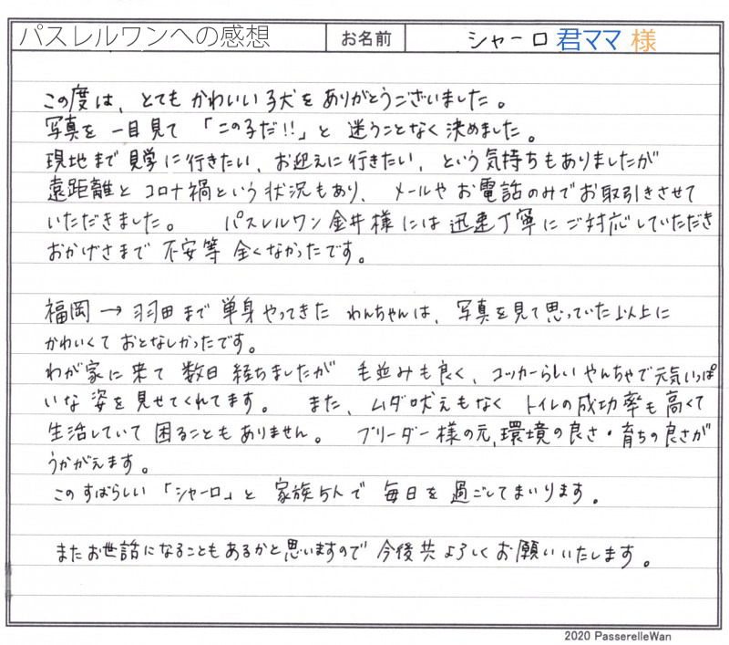 同県より東京都提携犬舎へご見学、お迎えと2度お越し頂きました。 今まではペットショップさんでお迎えされていたご家族様ですが、ブリーダーさんより直接迎えるというメリットを感じていただけて嬉しく思います。 はじめのお問い合わせで少し緊張頂いたようで、今後もお気遣いなく、いつでもご連絡ください! 飼育で困ったこと等ございました際には、ご遠慮なく当方までご相談くださいませ! どうぞ、素敵なアメリカンコッカースパニエルライフをお送りください・・・☆★☆ この度は当店をご利用いただき誠にありがとうございます。