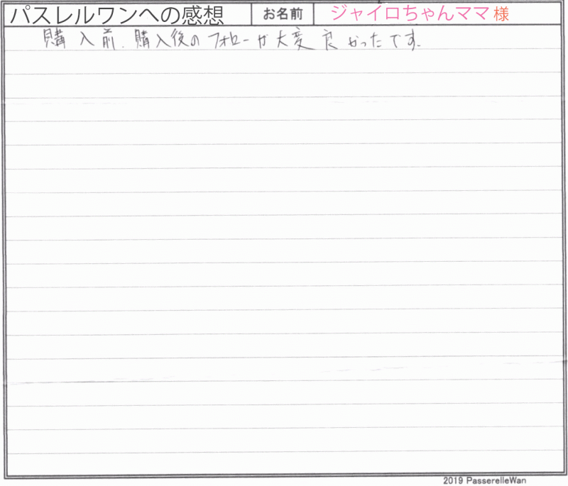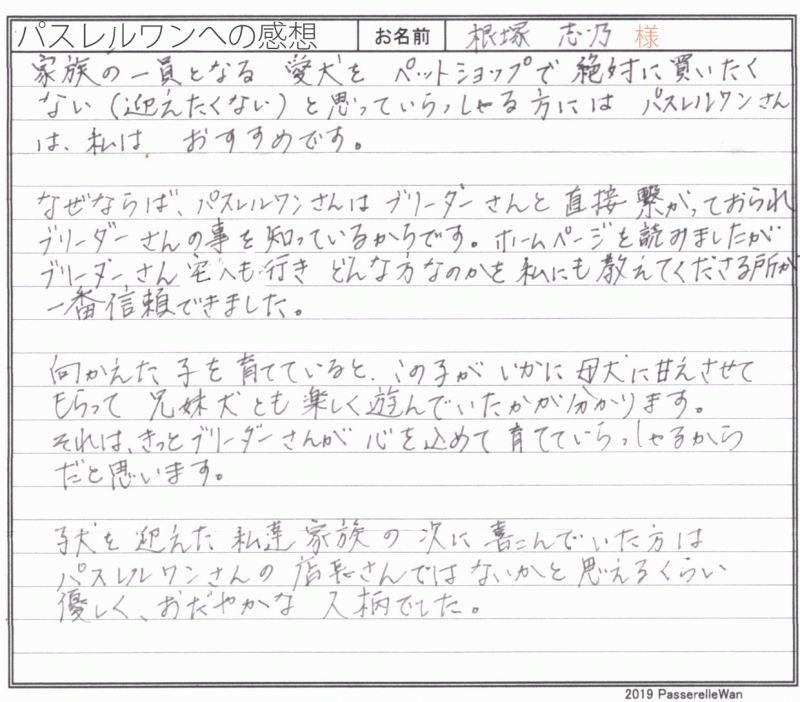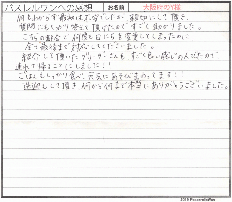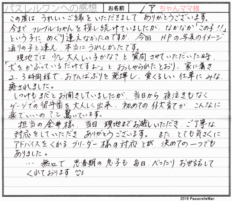 大阪府提携犬舎へご見学・お迎えと2度お越しくださいました。 ご見学の際にはお子様方もご一緒に、素敵な笑顔が飛び交い楽しい時間を過ごせました^^ アラレちゃん、とても可愛いお名前も命名くださり、元気一杯ご家族様の元育っております♪ 飼育の中で、何かお困りごとがございました際には、引き続きご遠慮なく当方までお問い合わせください! どうぞ素敵なフレンチブルドッグライフをお送りください・・・☆★☆ この度は当店をご利用いただき誠にありがとうございます。
