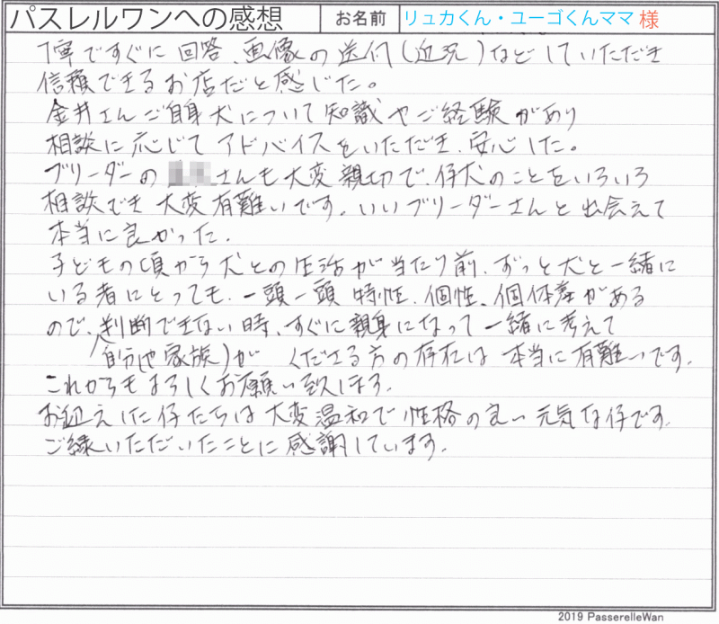 兵庫県より、鹿児島県犬舎まで、新幹線でお越しくださいました。 兄弟が離れるのを寂しく思い、兄弟でお迎えくださいました^^リュカ君とユーゴ君は仲良く育っております♪ 小さいときから、ワンコと生活をされてきたご家族様、多頭飼いはその経験からも自然の流れだったように思います☆ ブリーダーさんも兄妹で巣立て大変安心されております^^リュカ君&ユーゴ君の今後の成長が大変楽しみです♪ 今後も困ったこと等ございましたらご遠慮なく当方ブリーダーさんまでお問い合わせください! どうぞ、素敵なフレンチブルドッグライフをお送りください・・・☆★☆ この度は当店をご利用いただき誠にありがとうございます。