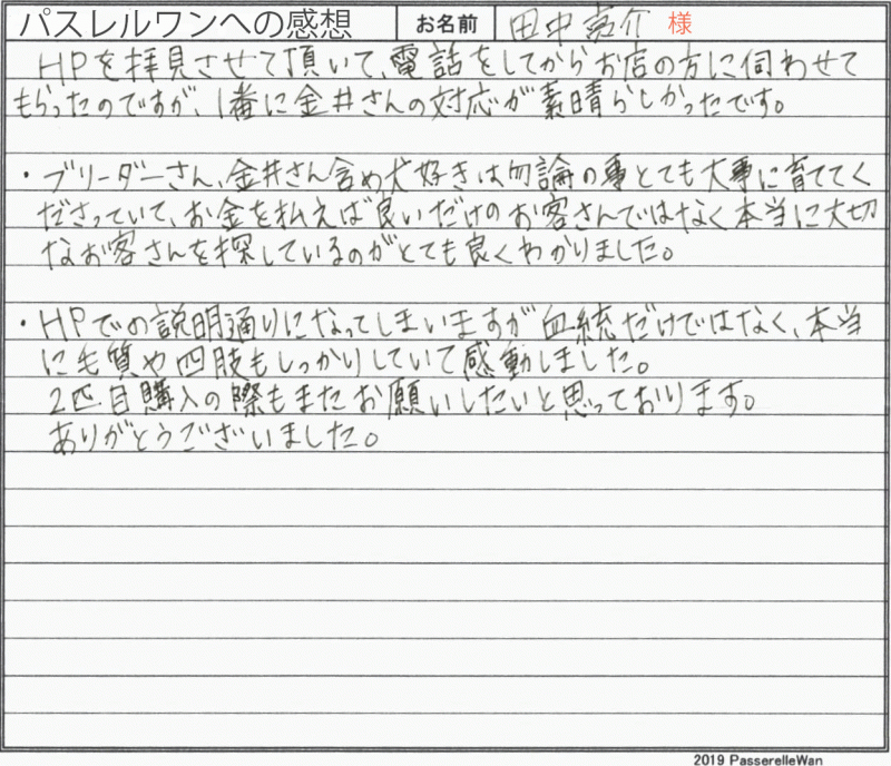 子犬選びの窓口より当方へご来社の上、約3月後にお迎え時期を設定しその日に向けてお話合いを重ねてまいりました。 ご見学前には奥様もお連れいただき、ご来店も下さり計画性を持ってドッグライフの日を楽しみにお待ち頂きました。 待ちに待ったご見学の日、ご希望の子犬とのご対面にご夫婦様共に大変喜んで頂けました^^ お迎え後も初めての子育てですが、可愛いはじめ君のことです。苦も無く楽しく育ててくださっており感謝でございます♪ 引き続き、困った際にはいつでも遠慮なくご相談、ご来店ください^^ どうぞ素敵なフレンチブルドッグライフをお送りください・・・☆★☆ この度は当店をご利用いただき誠にありがとうございます。