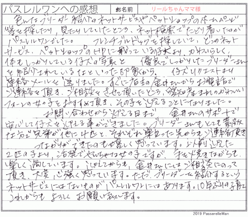 先住犬ともフレンチブルドッグと暮らされてこられました大のフレンチブル好きのご愛犬家様です。 フォーンのリールちゃんへ良縁を感じてくださり、名古屋駅にてブリーダーさんよりお引渡しさせて頂きました。 お迎え後も我が子として大事に育ててくださり、成長報告も大変うれしく思います^^ これからお久しぶりの子育てで、ご不安なことがありました際にはご遠慮なくご相談ください!是非ワクチンプログラムが完了しましたら、パスレルフレンチ(事務局)の方にも遊びにお越しくださいましたら幸いでございます。 どうぞ、素敵なフレンチブルドッグライフをお送りください・・・☆★☆ この度は当店をご利用いただき誠にありがとうございます。
