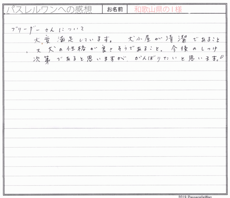 和歌山県より三重県犬舎までご見学にお越し頂きました。お迎えの際にはブリーダーさんが和歌山まで出向いてくださりお引渡しさせて頂きました。 先住犬が虹の橋を渡り、新しい家族の一員として、紀州犬と暮らされたいと子犬リクエストを頂戴いたしました。 実際に犬舎にお越し頂き、清潔な犬舎環境、また親犬や犬舎の子たちの性格の良さに安心して頂けたことと思います^^ 和歌山の環境の良い血で、これからたくさんのことを学ばせてあげてください^^ どうぞ、素敵な紀州犬ライフをお送りください・・・☆★☆ この度は当店をご利用いただき誠にありがとうございます。