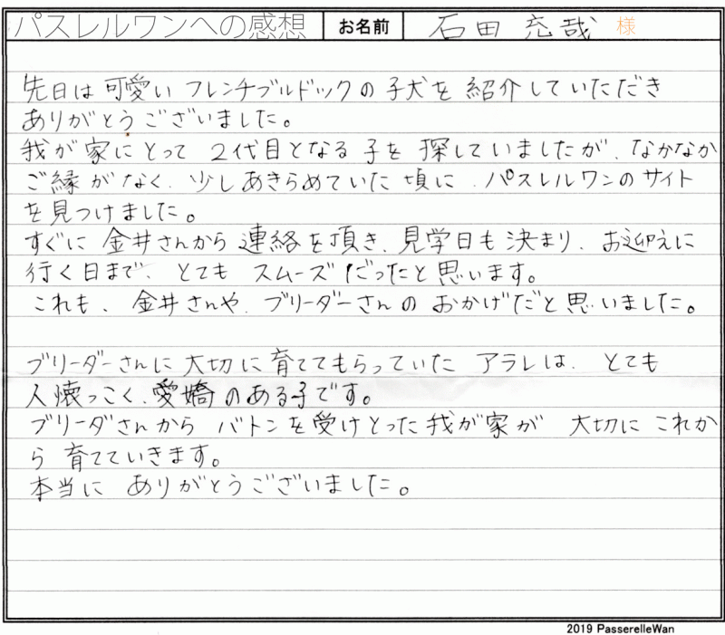大阪府より徳島県犬舎までフェリーを乗り継ぎご見学の上、良縁が結ばれお迎え頂きました。 もともとはフォーンの子をお問い合わせいただきましたが、ご見学後大変気に入っていただけましたごん太君との赤い糸が結ばれていたのだと思います^^ また、お迎え当日、その後も当事務局兼パスれフレンチ(フレンチブルドッグ専門店)まで良く遊びに下さり大変うれしい限りでございます☆ 今後もどうぞよろしくお願い申し上げます。困った際にはいつでもお店へご来店くださいませ! どうぞ、素敵なフレンチブルドッグライフをお送りください・・・☆★☆ この度は当店をご利用いただき誠にありがとうございます。