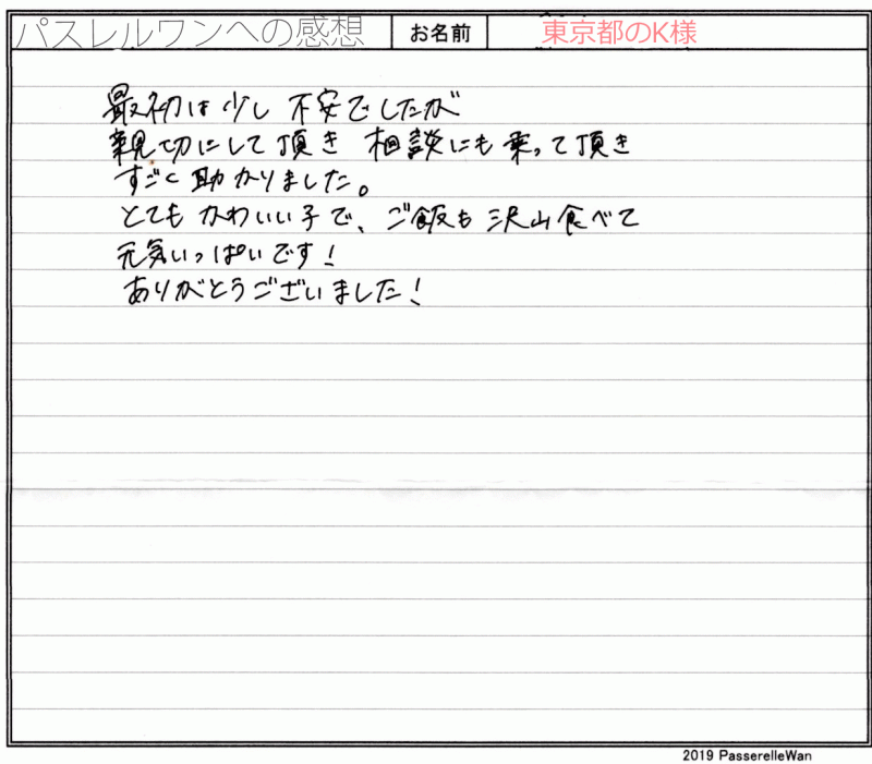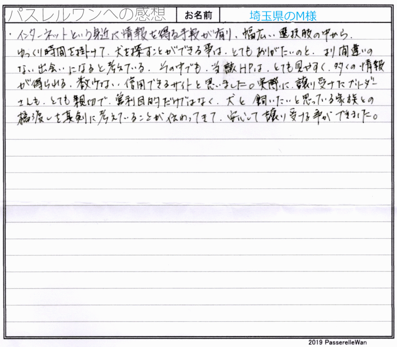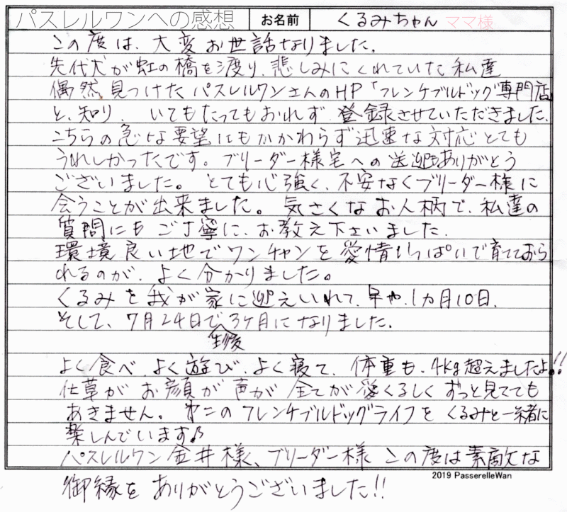 東京都犬舎へご見学の上、良縁が結ばれ当日埼玉県ご自宅へご一緒にお連れ帰り頂きました。 ご見学の日時を決めるまでは、ご出張が多いパパ様のご調整も大変だったことと思います。 ただ、この子に運命的な縁を感じてくださった娘様のためにもパパ様頑張ってご出張先の三重県より帰ってきてくださいました。 実物の子犬は当然ながらお写真や動画と比べ物になることもなく大変気に入っていただけました^^嬉しいお言葉も仕事冥利に尽きる思いでございます! 埼玉県の地で、どうぞ素敵なフレンチブルドッグライフをお送りください・・・☆★☆ この度は当店をご利用いただき誠にありがとうございます。
