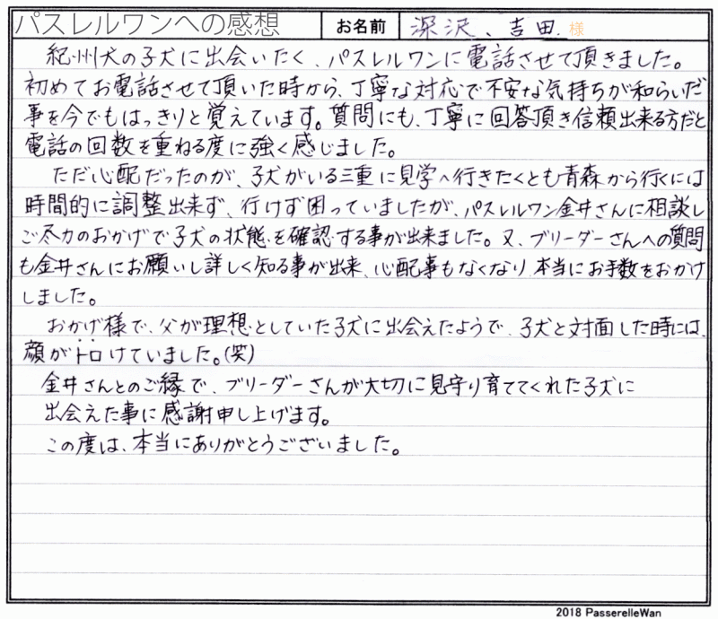 秋田空港にて代行説明をご実施の上お迎え頂きました。 代々、紀州犬がお好きな、インターネットが苦手なお父様の代わりに、娘様が当方といろいろと担当されお話を進めさせて頂きました。 何十年と紀州犬を飼育してこられたお父様にも、まこちゃんの犬質を喜んでくださり、当方ブリーダーさん共に安心しております^^ これからやんちゃ盛りに入ると思いますが、経験豊富なご家族様ですので、是非楽しまれながら、伸びのび、まこちゃんを育ててあげてください☆ どうぞ、素敵な紀州犬ライフをお送りください・・・☆★☆ この度は当店をご利用いただき誠にありがとうございます。