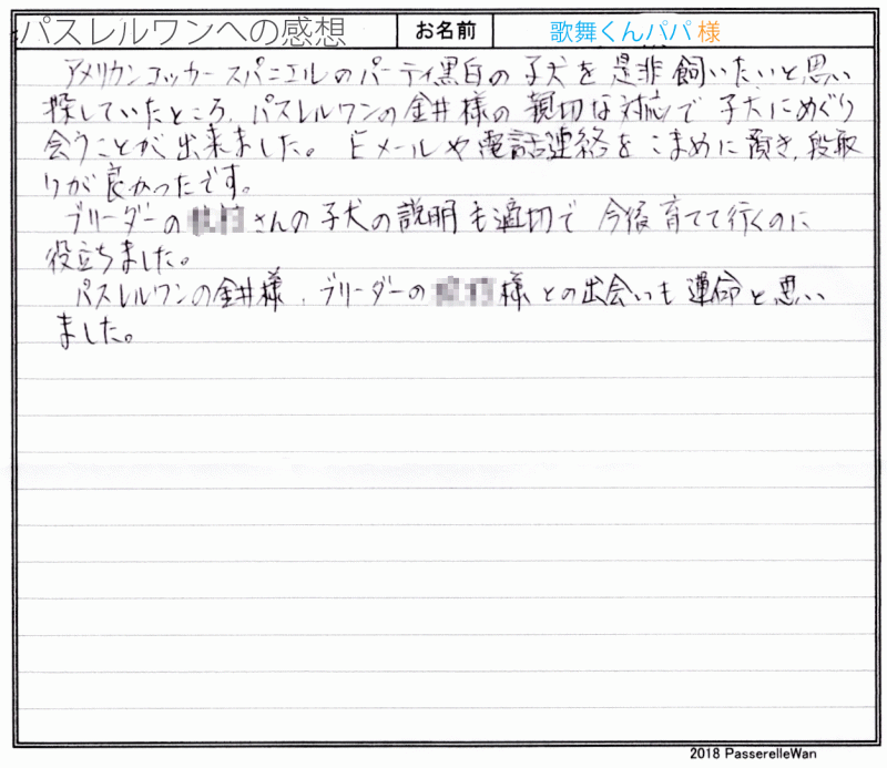 大阪府の犬舎までご見学、お迎えと2度お越しくださいました。 先住犬のアメリカンコッカースパニエルが虹の橋を渡り、新しい良縁を願い当方へお問い合わせくださいました。 この度は均等に柄の入ったパーテヒィー柄をお探しということで、募集ページに未掲載でした歌舞君を優先してご紹介させて頂き、良縁と至りました。 お迎えの際はに直接ご家族様ともご挨拶でき、大変暖かいご夫婦様へ歌舞君をお迎え頂き心より嬉しく思います。 歌舞君との出会いは、きっと運命だったのだと思います!^^ 引き続きどうぞ、素敵なアメリカンコッカースパニエルライフをお送りください・・・☆★☆ この度は当店をご利用いただき誠にありがとうございます。