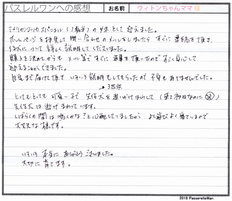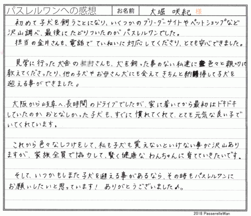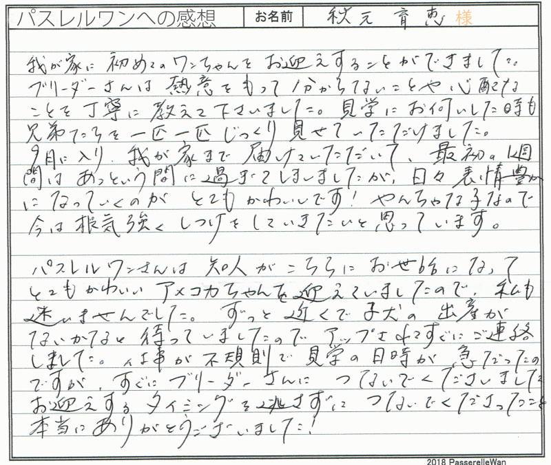 岐阜県より皆様で大阪府犬舎までお越しくださいました。 はじめてドッグライフを始められる中で、たくさんの所でお調べになられた上で、最後に当方へお問い合わせ頂いたようです。 ご家族様のお役に立てたようでまずは心より嬉しく思います。 はじめての飼育でご不安もあったことと思いますが、お迎え後も大事に大事にジャスミンちゃんを育てくださり、当方ブリーダーさん共に大変安心しております^^ 可愛いお顔立ちのジャスミンちゃん、きっと岐阜県で人気者になること間違いなしですね^^ 引き続きどうぞ、素敵なアメリカンコッカースパニエルライフをお送りください・・・☆★☆ この度は当店をご利用いただき誠にありがとうございます。