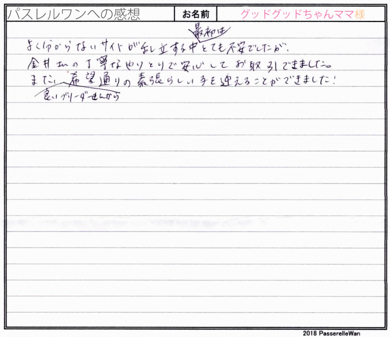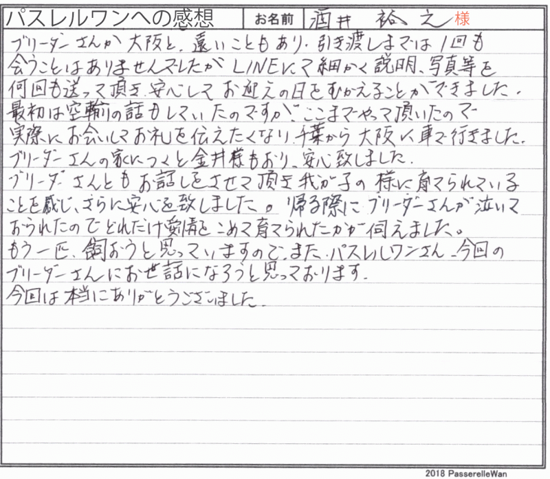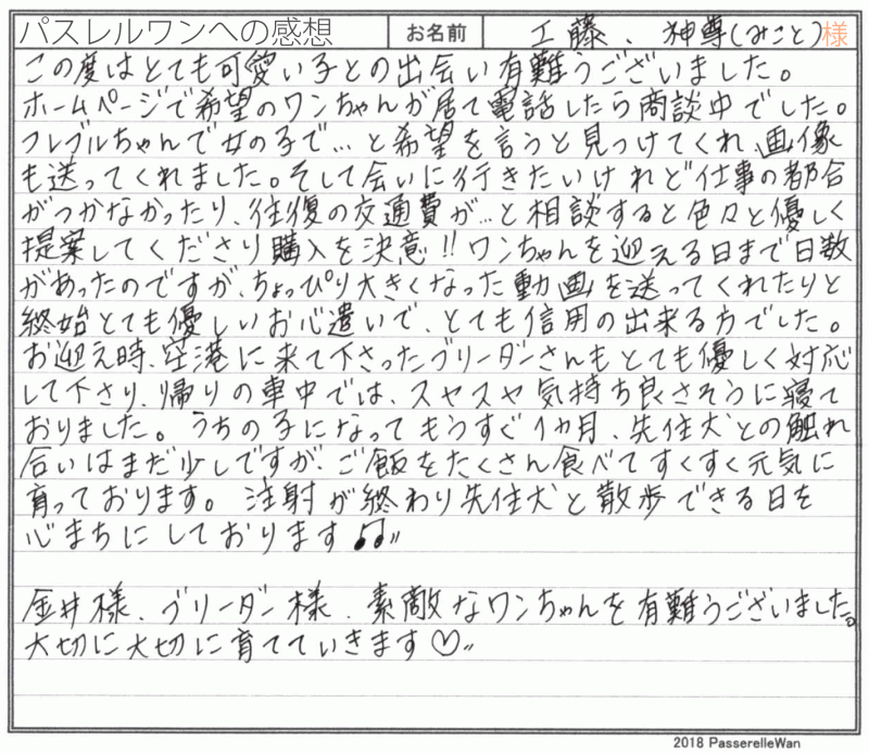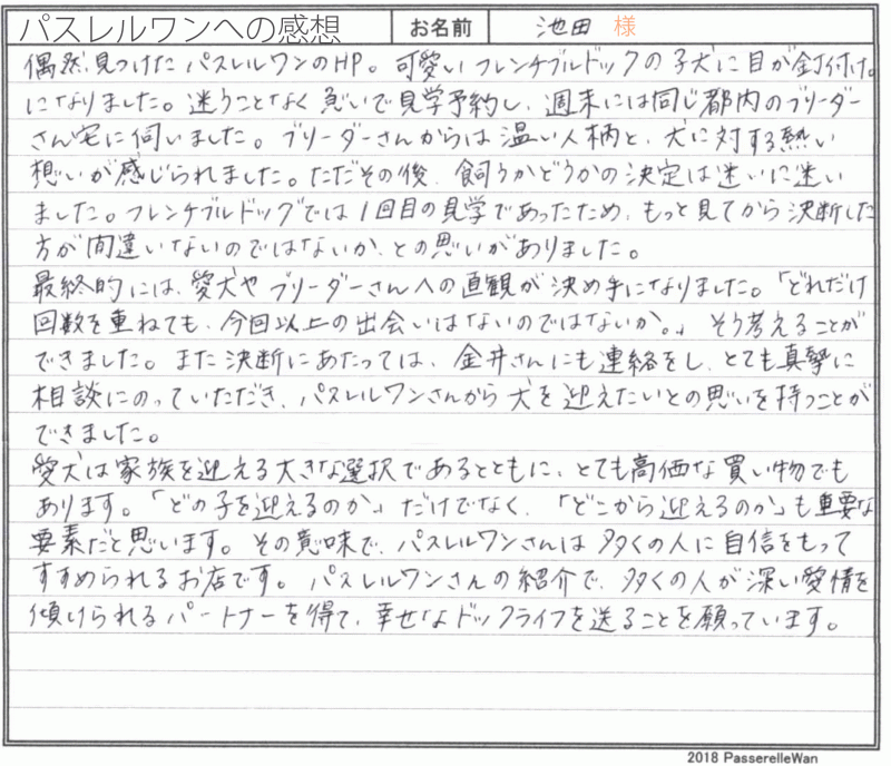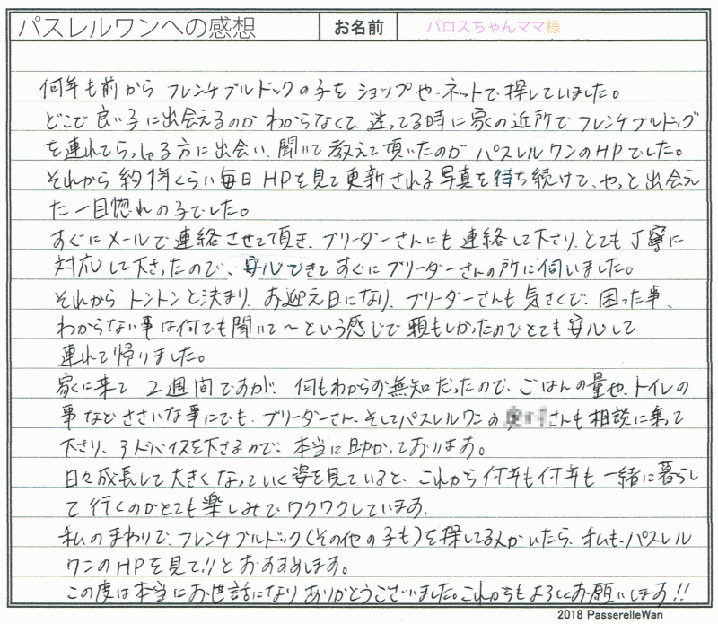 埼玉県よりご見学・お迎えと合計4度お越しくださいました。 可愛い子犬たちに、皆様で運命の子が度の子だろうかと日々嬉しいお悩みを抱えらえる日々^^ ワンちゃん、猫ちゃん共に多頭飼いの経験も長い、愛犬家のご家族様です。 最終的にご家族様の一員としてお決め頂きました子犬と、これからどのようなフレブルライフをお送りになれるか楽しみでなりません♪ 経験豊富なご家族様ですので心配しておりませんが困ったことなどございましたらいつでもご連絡ください☆ どうぞ、素敵なフレンチブルドッグライフをお送りください・・・☆★☆ この度は当店をご利用いただき誠にありがとうございます。