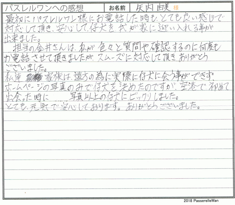 羽田空港にて代行説明を実施の上、お引渡しさせて頂きました。 当日は、代行説明者の方で至らない点があったようで大変失礼いたしました。周知徹底の上改善に努めさせて頂きます。 ルナちゃんは早速新しい環境下でも馴染んでいるようで、当方ブリーダーさん共に安心しております☆ 班も綺麗なルナちゃんが、埼玉県の地で今後どのような優良なボストンテリアに成長していくか今から楽しみです^^ どうぞ、素敵なボストンテリアライフをお送りください・・・☆★☆ この度は当店をご利用いただき誠にありがとうございます。