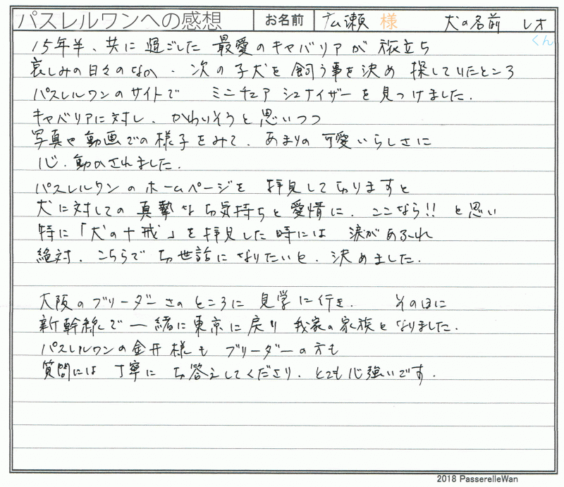 東京都より大阪府犬舎までご見学頂き、良縁の末、ご一緒にお連れ帰り頂きました。 先住犬のキャバリアが虹の橋を渡り、悲しみの日々が続く中、落ち込んでいく気持ちを立て直す意味でも、再度ドッグライフを決意、当方へお問い合わせくださいました。 お母様を思い娘様が代表していろいろとご対応くださり、レオ君との赤い糸が結ばれ、お母様の初対面☆膝の上でくつろぐレオ君のお写真です♪ また明るい楽しく、当面は慌ただしい日々が続くことですね^^ どうぞ、素敵なミニチュアシュナウザーライフをお送りください・・・☆★☆ この度は当店をご利用いただき誠にありがとうございます。