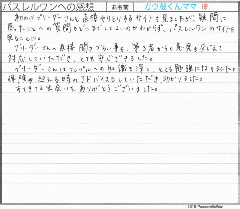 兵庫県よりご見学・お迎えと二度大阪府犬舎までお越しくださいました。 ご見学の際にはお子様もご一緒にお越しくださり、可愛いガウ蔵くんに大変喜んでいただけました^^ "第三者からの意見を交えて対応していただき"との貴重なお褒めのご意見、当方も仕事冥利に尽きる思いでございます。お顔立ちの可愛いガウ蔵君の成長がこれから大変楽しみですね^^いずれオフ会も開きたいですね☆ 今後も、困ったことやご相談事がございました際にはご遠慮なく当方ブリーダーさんまでご相談ください。 どうぞ、素敵なフレンチブルドッグライフをお送りください・・・☆★☆ この度は当店をご利用いただき誠にありがとうございます。