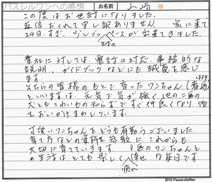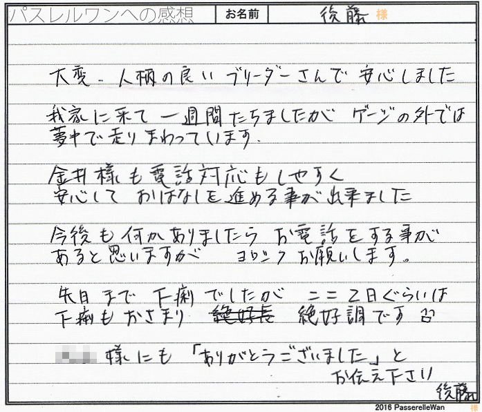当方へ優先登録を頂戴し、ご見学にお越しくださりメイちゃんへご縁を頂戴いたしました。 お迎えの際は当方が兵庫県のご自宅までお届けに上がらせて頂きました。 ご見学の時よりもしっかりとした体つき・動きにとても安心して頂けました^^ 多方面で大いにご活躍されておられますご家族様からの温かい貴重なお言葉、しっかりと受け止めてまいります。 今後も期待を裏切らぬよう、今後も日々皆様のお役にたてますよう、喜んで頂けますよう企業努力に努めてまいります! また是非近くに寄りました際にはお言葉に甘え成長の様子を拝見しに参ります^^ このたびは当店をご利用いただき誠にありがとうございました。