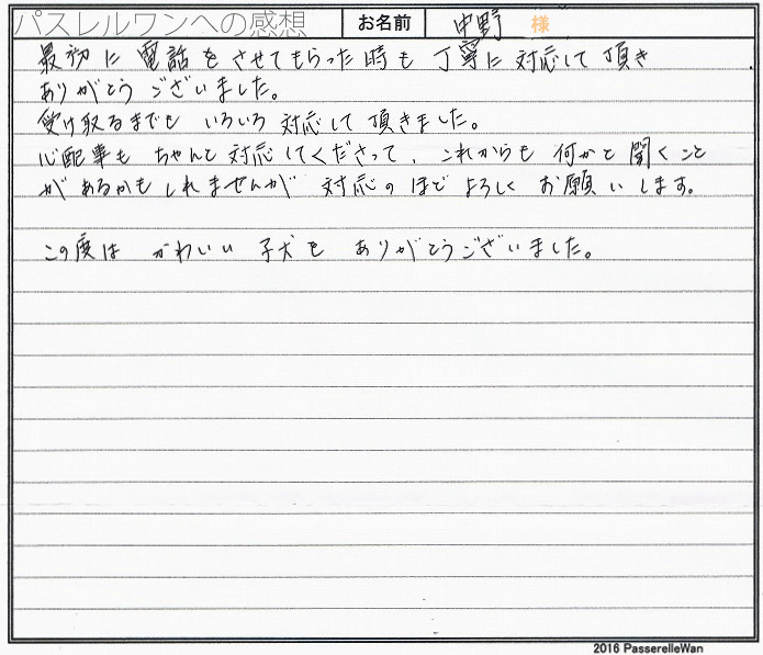 大阪府犬舎までご見学にお越し頂き、お迎えの際はご自宅までお届けに上がらせて頂きました。 正直ご見学後ご決断されるまでは、先住犬への思いが当然のことながら強く、決断できるかご不安もあったようですが、子犬はどことなく先住犬にも似ていたようで、重なったようで、様々な思いがおありのことと思いますが、子犬との良縁はきっと先住犬も喜んでくれていることと思います^^先住犬との悲しみを乗り越えられ、そうた君をお迎え頂き誠にありがとうございます。毎回お伝えしていることですが、是非先住犬で学んだ経験を新しい一員、そうた君にいかしてあげてください。ご家族様のわんこに対する愛情はそうた君の幸せを約束して頂いております。またお届けの際はお心遣いを頂戴し、改めて感謝申し上げます。 この度は当店をご利用いただき誠にありがとうございます。