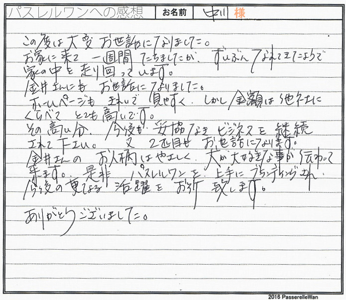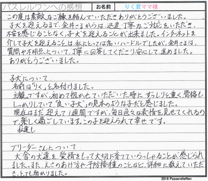 お迎えの際は徳島県より大阪府犬舎までお越しくださいました。 いろいろとご不安もおありだったことと思いますが、当方ブリーダーさんをご信頼頂き感謝申し上げます。 ブリーダーさんは自身のところで産ませた子たちのみを直販という形で店舗も構えておられます。 少し説明不足があったようでびっくりさせてしまい申し訳ございません。直接ブリーダーさん、両親犬もご覧頂き、その犬質の高さにご納得下さり光栄でございます。 これからも徳島県の地でうららちゃんがどのようなチワワライフを送っていくのかとても楽しみです^^ また是非成長報告などお待ちしております☆ この度は当店をご利用いただき誠にありがとうございます。