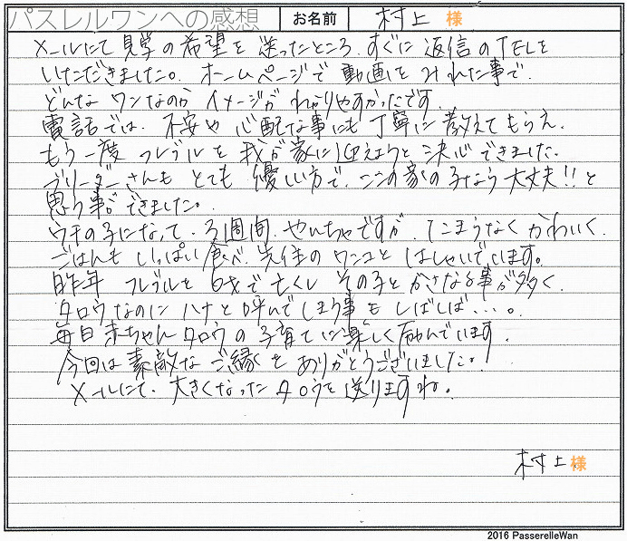 兵庫県ブリーダーさん宅までご見学・お迎えと2度お越しくださいました。 わんこが大好きなとてもさわやかなご家族様で、当方メンバーズショップもご愛顧下さり、感謝申し上げます。 ご見学の際は、当方はお立ち会いできませんでしたが、ブリーダーさんが、真摯にご対応下さり良縁となり、新しい環境下でも健やかに育つ軍曹君に安心しております^^ もうすぐお散歩デビューも間近、軍曹君のこれからも影ながらしっかりサポートしてまいりますのでどうぞ宜しくお願い申し上げます。 このたびは当店をご利用いただき誠にありがとうございました。