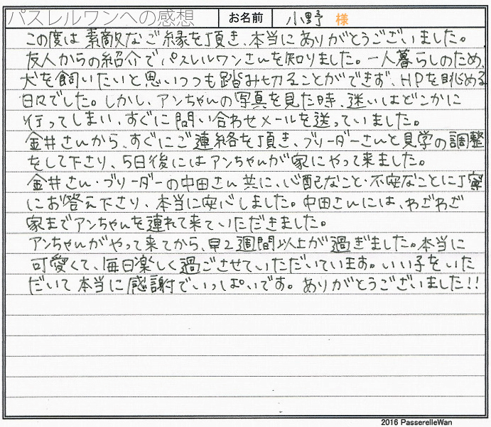 東京都犬舎までご見学にお越しくださいました。お迎えの際はブリーダーさんがご自宅までお届けしてくださいました。 当方より同じく東京都へ巣立ちましたりりちゃんのご家族様よりご紹介で当方へご連絡下さいました。 始めはどなたからのご紹介ということを伺っておりませんでしたが、小野ご家族様とお話ししている中で、そのお人柄と立地からりりちゃんママ様のご友人ということがすぐに気づくことが出来ましたw やはり愛犬家様の周りにはお人柄の似た愛犬家様が集まりますね^^ これからは先輩犬のりりちゃんと一緒にアンちゃんのコンビに要チェックです!何か困ったことがございましたらいつでも当方までご連絡下さい! このたびは当店をご利用いただき誠にありがとうございました。