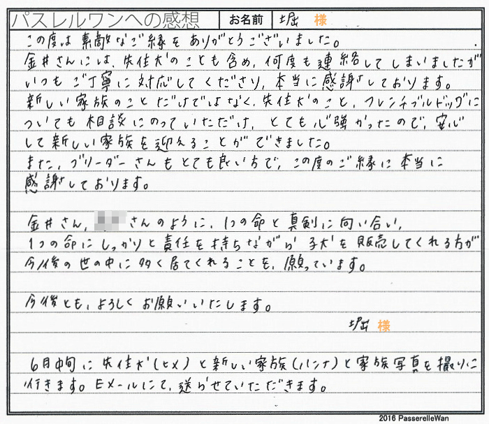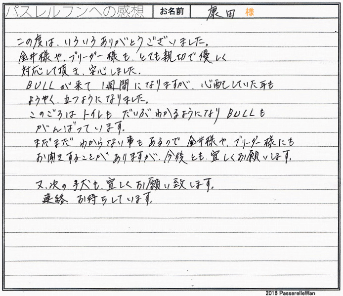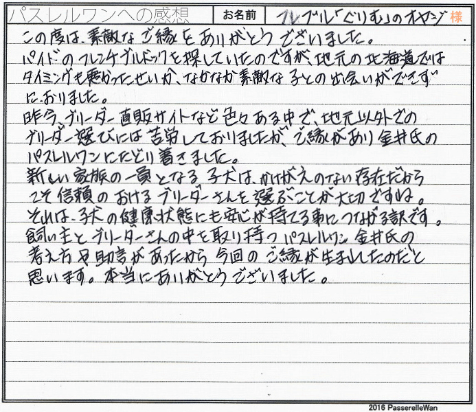 大阪府ブリーダーさん宅までご見学お迎えと2度足を運んでくださいました。 ペットショップさん等フレンチブルドッグをご見学に行ってみたようですが、ご見学頂きました小鉄君の毛艶、容姿など、その違いにすぐにご縁を結んで頂きました^^ ダンディーなブリーダーさんともお話が合ったようで、安心してお迎えいただけたようで大変うれしく思います☆ これから、飼育の中で困ったことなどございましたらお気遣いなくいつでも当方ブリーダーさんまでご相談ください。影ながらサポートさせて頂く所存でございます。 このたびは当店をご利用いただき誠にありがとうございました。