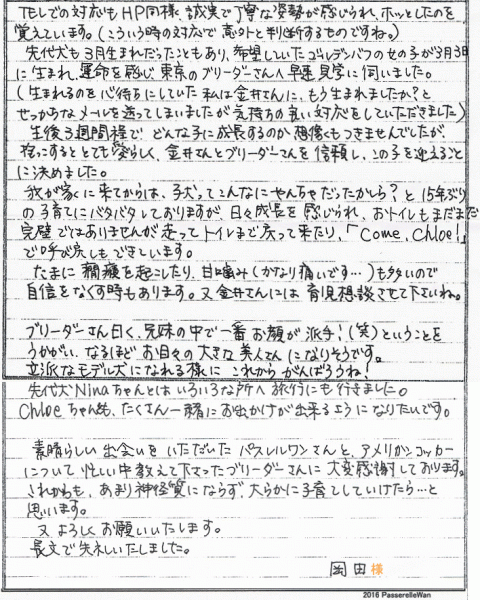 神奈川県より東京都犬舎までご見学・お迎えと2度お越しくださいました。 先住犬が虹の橋を渡り、悲しみの中、当方へお問い合わせ下さり、ご家族様のご希望を細かくお伺いさせて頂きました。 可愛いオーダーメイド主体でドッグウェアのショップを手掛けておられるご家族様、先住犬キャバリアのNinaちゃんはショップの看板モデルも担っておりました。 この度お迎えいただきましたクロエちゃんもいずれショップの看板犬として大活躍してくれることを今から期待しております^^きっとクロエちゃんなら人気者になること間違いなしです^^ 子育てにまだまだ大変な時期が続くとは思いますが、ご感想でお書き頂いた通り気負うことなく、困った時はいつでも当方までご相談ください! 先住犬で培った経験も是非活かしつつ、楽しい素敵なコッカーライフをお送りください・・・☆★☆ このたびは当店をご利用いただき誠にありがとうございました。