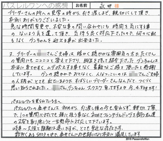 東京より新幹線を乗り継ぎお迎えにお越しくださいました。 お迎えの際は新大阪駅にてお引渡しさせて頂き、狭い車内ではございましたが、いろいろとご注意点含めご説明させて頂きました。 グーグー君の為に、お家もリフォームしてくださりお迎えの日を楽しみにしてくださっておりました^^ 現在日々子育てに奮闘中でございます☆いろいろと初めてのことでわからないことも多いと思います。引き続きご遠慮なく当方までご相談くださいませ! 東京、大阪と距離はございますが、素敵なフレンチブルドッグライフを送っていただけますよう精一杯サポートしてまいります・・・☆★☆ また東京開催のオフ会がありました際は是非再会を楽しみにお待ちしております。 この度は当店をご利用いただき誠にありがとうございます。