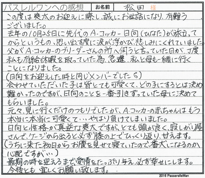 静岡県より愛知県ブリーダーさん宅までアネラちゃんをご見学にお越しくださいました。 ご見学後、少し小振りなアネラちゃんをとても気に入ってださり、またブリーダーさんの優しい人柄にも触れ安心して当日ご一緒にお連れ頂きました☆ アネラとはハワイ語で天使と言う意味があります。当方では東京都に巣立ちました同じくアメリカンコッカースパニエルのアネラちゃん以来2度目のお名前となります♪個人的にもとても好きなお名前です^^ 久保田ご家族様を天使のようなその可愛い笑顔でたくさんの幸せを運んでくださいアネラちゃん♪ このたびは当店をご利用いただき誠にありがとうございました。