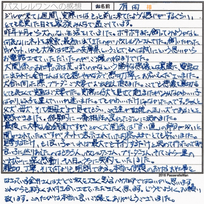 兵庫県犬舎までジルちゃんへ逢いにご見学、お迎えと2度お越し頂きました。 ご見学の際は兄妹、両親犬、祖母犬とご覧頂き、子犬の未来予想をしっかり立てて頂きました。 なかなか巷では見る機会の少ないウイペットですが、有田ご家族様の元、素敵なウイペットライフを送って頂ける事でしょう・・・☆★☆ またご感想も本当に励みとなります有難いお言葉を頂戴し感謝申し上げます。健全なペット業界へ微力ではありますが今後も邁進してまいります! 今後もジルちゃんとのドッグライフの中で困ったことなどございましたらいつでもお気軽に当方、ブリーダーさんまでご相談ください! この度は当店をご利用いただき誠にありがとうございます。