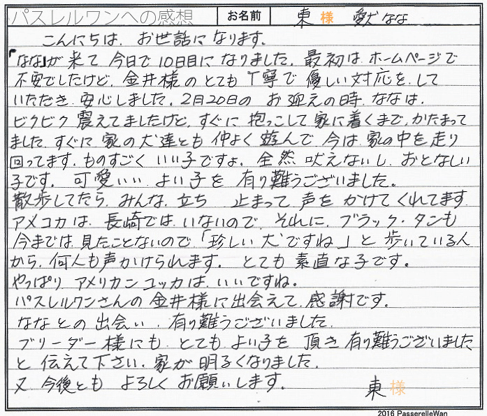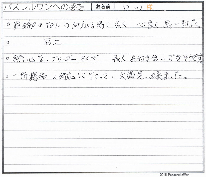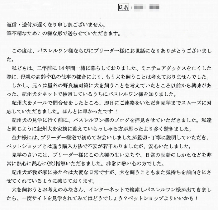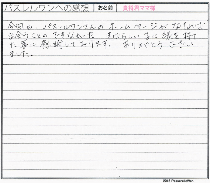 こだわり派の中西様に子犬を気に入って頂きとても嬉しく思います。 らんちゃんをお迎え後広いご自宅を自由気ままに走らせてあげ、優しいお言葉で出迎えてくださいました。 お引渡しの際もたくさんのお話を聞かせて頂き大変勉強になりました。 貴重なお写真も拝見でき、ありがとうござます。 わんこに長けおられるご家族様ですので当方ブリーダーさん共に安心しております^^ このたびは当店をご利用いただき誠にありがとうございました。