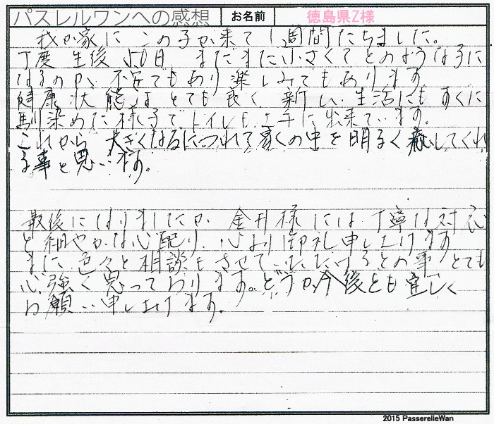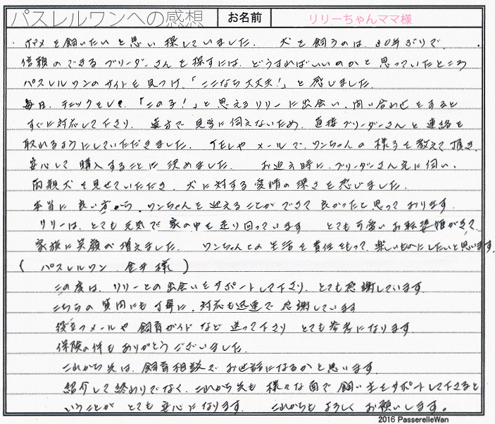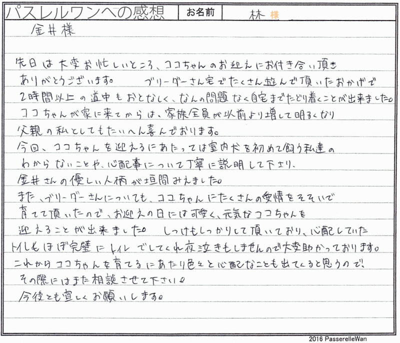 東京より広島のブリーダーさん宅までリリーちゃんのお迎えにお越しくださいました。遠路はるばる誠にありがとうございます。 ワンコを飼われるのは30年振りであったご家族様、当方をお頼り頂き、大変光栄と共に、お迎え後も喜んで頂けていることに心より嬉しく思います。 お迎え後もリリーちゃんは元気に走り回り、ご家族様に笑顔の花を咲かせているようで、当方ブリーダーさんも大事に育ててくださるMご家族様に感謝申し上げます。 もし飼育などで困った際は、ご遠慮なく当方までお気軽にご相談ください。当方もこれからもリリーちゃんの成長がとても楽しみですのでよろしければ成長写真等お送りくださいましたら幸いでございます^^ このたびは当店をご利用いただき誠にありがとうございました。