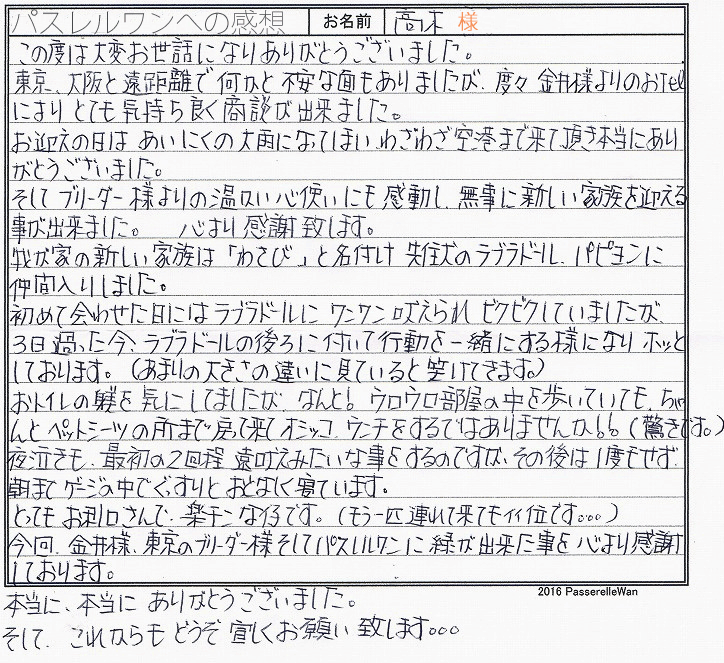 伊丹空港で当方が子犬を受けとり代行説明後、お引き渡しをさせて頂きました。 先住犬はラブラドールとパピヨンと暮らされておられるご家族様、この日新しく仲間に加わるわさびちゃんをとても楽しみにして下さっておられました^^ お迎え後も新しい環境で、早速お利口にトイレも成功しているようで、ご家族さま方を喜ばせているようで、大変嬉しく思います☆ 今回は、お問い合わせの際より色々とご配慮下さり、お心遣いに感謝申し上げます。またわさびちゃんと先住犬が楽しく遊ぶ様子など是非お写真お送りくださいませ♪ このたびは当店をご利用いただき誠にありがとうございました。