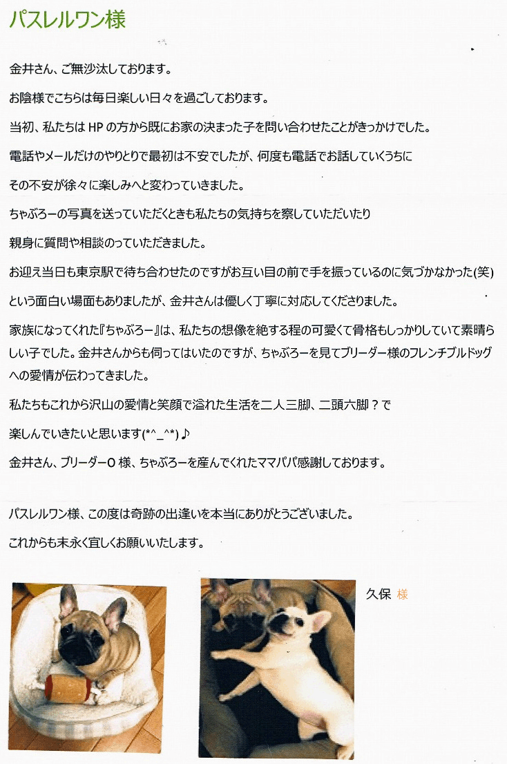 兵庫県犬舎までご見学・お迎えと2度足を運んでくださいました。 お人柄もとても優しい温かいご夫婦様で、とても素敵な良縁を頂きブリーダーさん共々喜んでおります。 お里帰りでリュー君を連れ犬舎に遊びに来て下さり、ブリーダーさんも楽しい時間を過ごせたようです^^ これからしつけの部分でも困ったことがございましたらいつでも遠慮なく頼ってください! リュー君と素敵なフレンチブルドッグライフをお過ごしください・・☆★☆ このたびは当店をご利用いただき誠にありがとうございました。