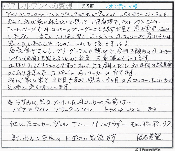 ご見学・お迎えと2度大阪府犬舎様までお越しくださいました。 アメリカンコッカースパニエル、トライ男の子で子犬リクエスト頂き、同時期トライの男の子の出産がございました。本当に運命としか言いようがないですね^^ コッカー一筋約30年のアメリカンコッカー専門犬舎で生まれた子犬にご見学当日お迎えをご決断下さいました。お迎えの際はお届けと重なりお立会いできませんでしたが、レオン君と先住犬たちと素敵なドッグライフをスタートされているようで嬉しく思います。 O様も愛犬家として飼育歴30年の大ベテランです。まだ、少し小ぶりですが、素晴らしいコッカースパニエルに育て上げてくださることと思います。また是非レオン君の成長のお写真お送りくださいませ^^ このたびは当店をご利用いただき誠にありがとうございました。