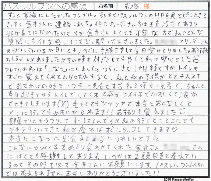 ご見学・お迎えと2度ブリーダーさん宅まで足を運んでくださいました。 ご見学の際は先約のご見学、お届け対応の為お立会いは出来ませんでしたが、兄妹の中よりブジュ君と運命の出逢いがあったようで心より嬉しく思います。 お迎え後は初めてのしつけに苦労もしながらも楽しそうにご相談して下さるご家族様に、安心と共に温かいご家族様にお迎えいただけた事改めてブジュ君は幸せ者と感じておりました♪ これからもフレブルライフの中困ったことがございましたらいつでもお気軽に当方までご相談・ご連絡下さい! このたびは当店をご利用いただき誠にありがとうございました。