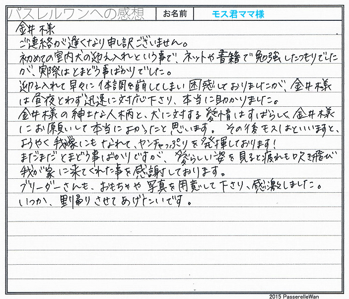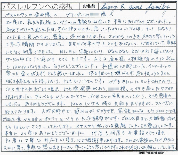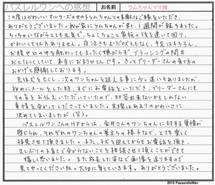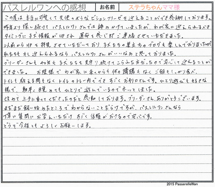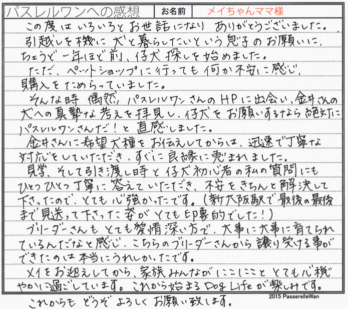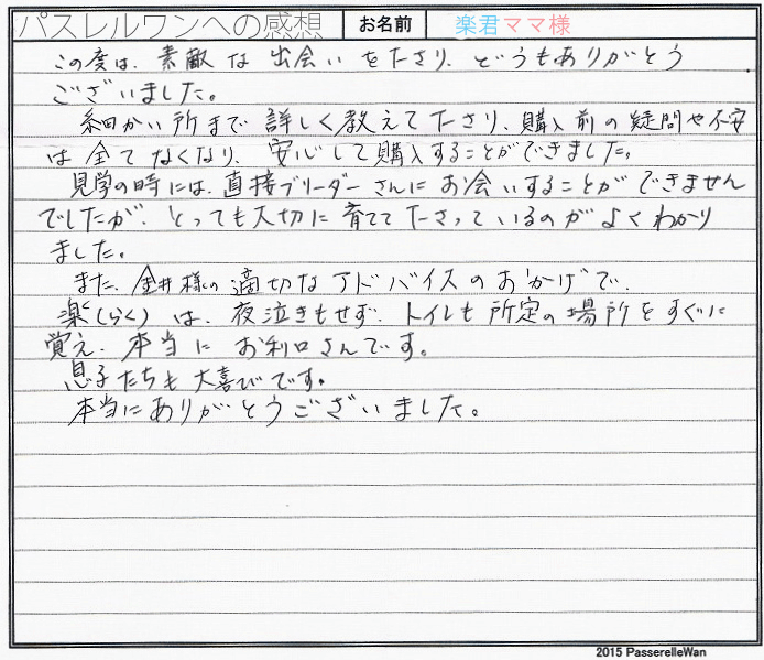 ご見学、お迎えと2度犬舎までお越しくださいました。 ご見学の際、お会いしました可愛い愛娘様とこれからどのようなドッグライフを送っていくのかがとても楽しみです。 ほのぼのとしたYご家族様の元でみやびちゃんも大らかに育つことでしょう^^ 何か困ったことがございましたらお気軽にいつでもご連絡下さい!近況のご報告もお待ちしております。 このたびは当店をご利用いただき誠にありがとうございました。