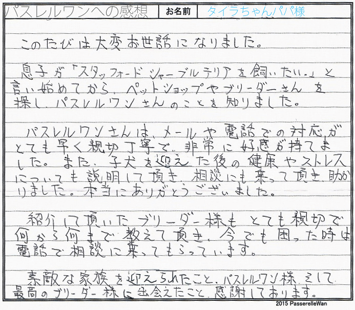 岡山県より三重県の犬舎までご家族様でご見学にお越しくださいました。 息子様がスタッフォードシャーブルテリアと暮らしたいとの想いにご家族様皆でドッグライフをご決断されました。 スタッフィーで名高い犬舎で、ブリーダーさんも親切ご丁寧にご説明もして下さったようで嬉しく思います。 今後も飼育面等で困ったことがありましたらご遠慮なくいつでもご連絡下さい。また可愛い成長写真も期待しております^^ このたびは当店をご利用いただき誠にありがとうございました。
