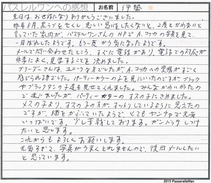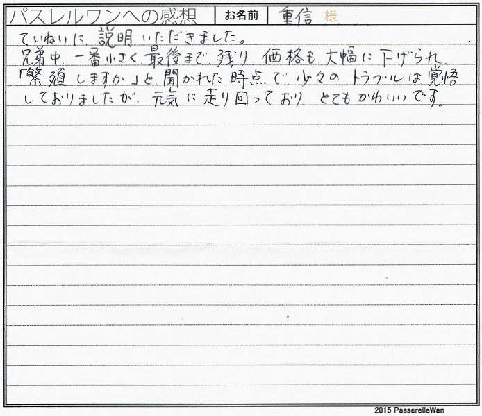 ご見学、お迎えと2度千葉県より足を運んでくださいました。お迎えの際はお立会いが出来ませんでしたが、愛娘様とお迎えにお越しくださり、楽しいひとときをお過ごしいただけたようです^^ 元気そうに育っているピース君の姿に安心しております^^ また兄弟のモス君も東京に巣立っておりますので関東で兄弟同士の再会があれば素敵ですね^^ このたびは当店をご利用いただき誠にありがとうございました。