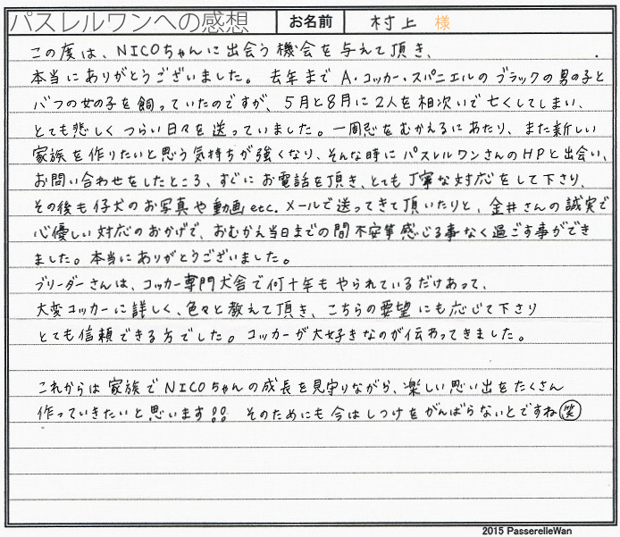 はじめてのご見学から合計3度ブリーダーさん宅まで足を運んでくださいました。 ニコちゃんとのご縁を信じとっても可愛く成長したニコちゃんをご覧になられた時には感無量の思いだったことと思います^^ ショップさんでの看板犬になる予定のニコちゃん☆見習いの様子是非ご報告をお待ちしております♪ 素敵なアメリカンコッカースパニエルライフをお送りください・・・☆★☆ このたびは当店をご利用いただき誠にありがとうございました。