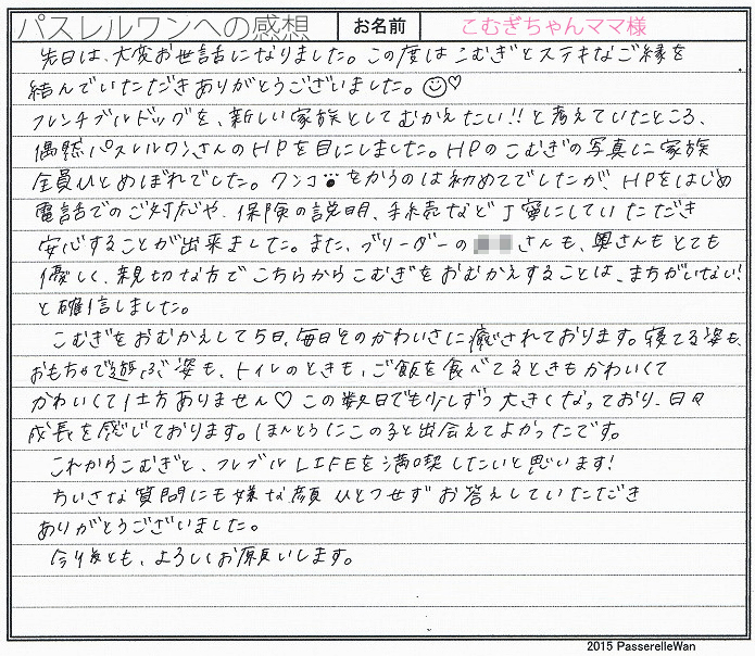 なかなか近隣で素敵な出会いに出会えずご苦労されたようでしたが、今回北海道提携ブリーダーさんの元で素敵な出会いとなり心より嬉しく思います。 当方も絶大の信頼を置くブリーダーさんの子犬はもちろんのこと、親犬もご覧頂き違いをご理解いただけたようで、安心いたしました^^ 困ったことがございましたらブリーダーさん共々お気軽にご相談ください! これから、自然豊かな北海道の地で、素敵なフレンチブルドッグライフをお送りください・・・☆★☆ このたびは当店をご利用いただき誠にありがとうございました。