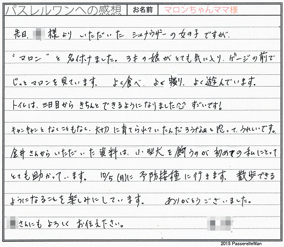 ご見学・お迎えと2度和歌山県の犬舎まで足を運んでくださいました。 可愛い娘様がとても喜んでおられる姿がとても印象的です^^お迎え後もマロンちゃんのお世話をしっかりしてくれているみたいで本当に嬉しいです☆ これからマロンちゃんの子育てに大変な事もあるかも知れませんが、困った時は悩まず当方ブリーダーさんへお気軽にご連絡・ご相談ください^^ このたびは当店をご利用いただき誠にありがとうございました。